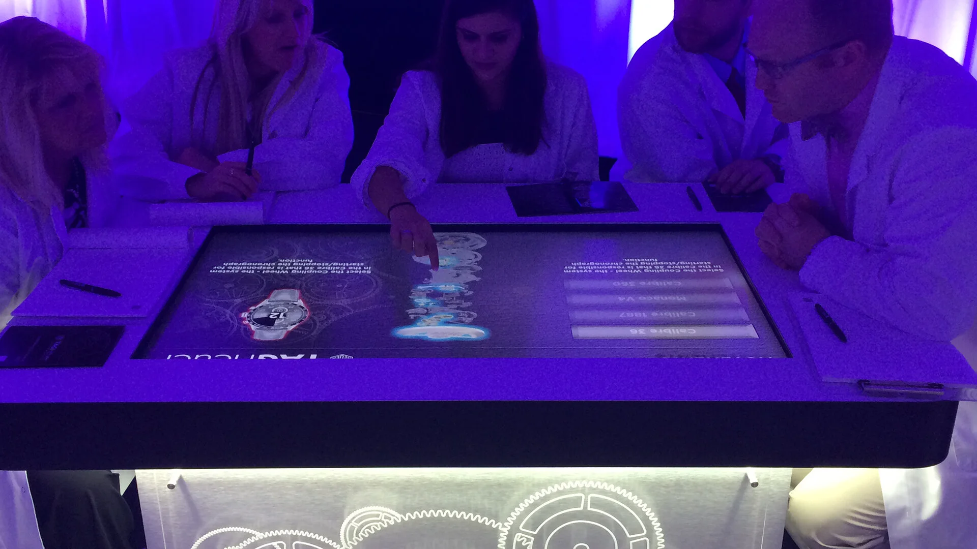 We created a technology-focused room transformation that went on tour throughout the United States and replicated a watchmakers lab. The tables synced to the videos and presentations of each team leader and tested their skills and knowledge after. We designed and developed competitive games on the touch screens where each team worked together to get more points than the other teams.